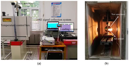 The main parameters of acoustic emissions include energy, amplitude, ringing count, etc. Energy is the size of the area enclosed by the acoustic emission signal curve and the time axis, directly characterizing the strength of the acoustic emission-event activity, and is a representative indicator for evaluating material damage. The low-temperature splitting test temperature was −10 °C. All Marshall specimens were insulated in a temperature-control box for 5 h before the start of the experiment. First, an appropriate coupling agent was evenly applied on the surface of the acoustic emission sensor, and then an elastic band was used to stabilize the sensor to the surface of the test piece. After confirming that the coupling between the sensor and the surface of the specimen was intact, the testing machine was started and loaded at a uniform rate of 1 mm/min. After the test piece was damaged, the test was stopped and the data saved. Figure 1 shows the test site. Based on the test results and according to T 0716-2011 and T 0713-2000 in the specifications [30], the calculation methods are shown in Equations (1)–(3).
