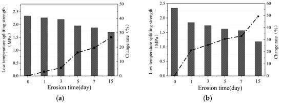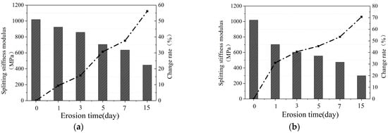 Figure 2a–c show the low-temperature-splitting strength of the mixture after water erosion at 20 °C, 40 °C, and 60 °C, respectively. The group with a water erosion time of 0 in the figure is the control group, which is not affected by water erosion. In addition, we use the “change rate” to represent the changes in relevant parameters after water erosion compared to the control group parameters, represented by black dashed lines in the figures.