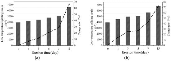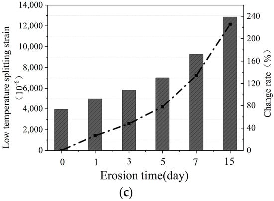 Low-temperature splitting failure strain. (a) 20 °C water erosion; (b) 40 °C water erosion; (c) 60 °C water erosion.