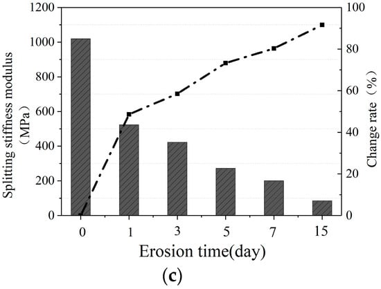 Low-temperature splitting failure stiffness modulus. (a) 20 °C water erosion; (b) 40 °C water erosion; (c) 60 °C water erosion.
