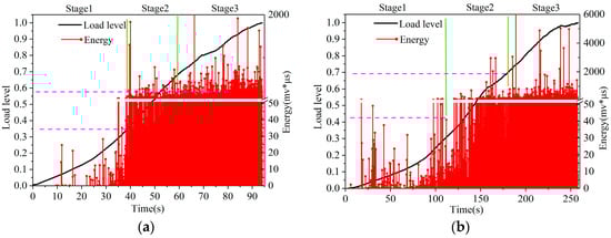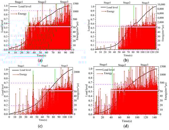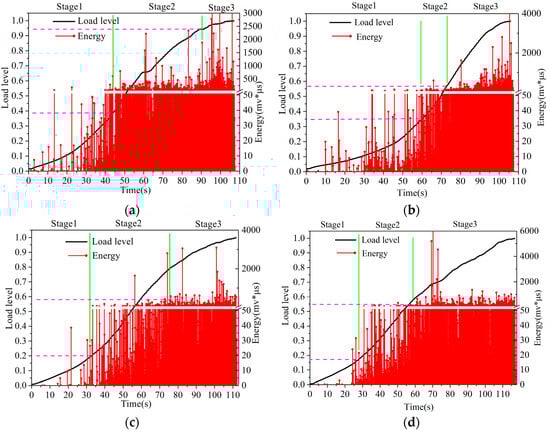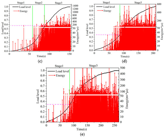 Figure 7 shows the “energy-load level” diagram of the CM-PAC specimen under water erosion at 60 °C based on the low-temperature splitting test, which shows a similar pattern to Figure 5 and Figure 6. That is, as the water erosion time increases, the first stage gradually shortens, and the second and third stages gradually advance. This indicates that after long-term erosion by high-temperature water, noticeable damage has occurred inside the specimen, and under the action of splitting load the crack propagation and failure stages inside the specimen will be significantly advanced. For Figure 7d,e, it is worth noting that the maximum acoustic emission energy released during the loading process of the specimen comes from the middle stage of loading, indicating that the specimen has already developed obvious cracks at this time. After this, although it can still bear the load, it has already experienced significant damage. Therefore, we excluded the second stage. In addition, with the increase in water temperature and water erosion time, the energy value of the specimen during the splitting process slightly decreases. This is because the higher the water temperature and the longer the erosion time, the more severe the damage inside the CM-PAC, and the smaller the total potential energy inside it.