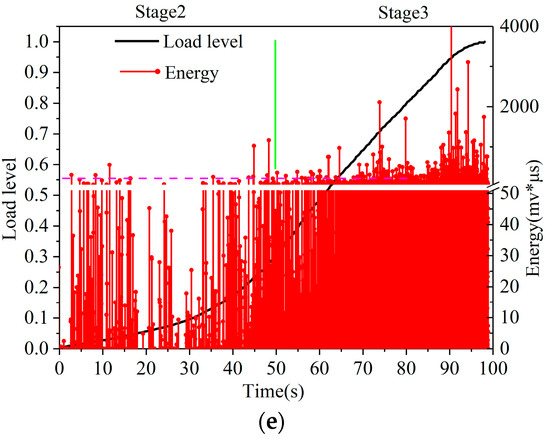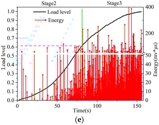 Furthermore, by comparing Figure 5a–e, it can be seen that with the increase in water erosion time, the energy parameters in acoustic emissions exhibit a certain pattern. For specimens with shorter water erosion time, as shown in Figure 5a,b, the signal values in the first stage are very low, indicating that the damage degree of the specimen is very small during the initial loading stage. When the water erosion time continues to increase, as shown in Figure 5c,d, the signal values in the first stage proportionately increase, indicating that after a long period of water erosion, damage occurs inside the specimen, and significant energy release occurs in the early stages of loading. When the water erosion time increases to 15 days, as shown in Figure 5e, the specimen exhibits dense acoustic emission signal values in the early stage of loading, and the energy amplitude is relatively large. The specimen directly entered the second stage. This indicates that after a long period of room-temperature water erosion, remarkable damage has occurred inside the CM-PAC. Under the action of load, there is immediately measurable energy release inside the mixture, and the specimen is prone to cracking.