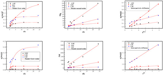 | Intra-Particle Diffusion | K [g/(mg·h1/2)] | 0.0271 | 0.1529 | 0.0527 | 0.0018 | 0.0036 | 0.0376 |
