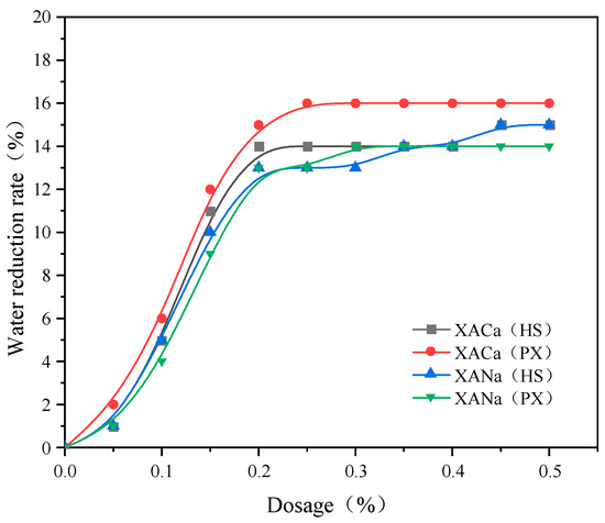 Align with their initial setting effects. At a dosage of 0.05%, both water reducers extend the final setting time by approximately 128%. At a dosage of 0.10%, XACa (PX) exhibits a slightly improved retarding effect, while the retarding effect of XANa (PX) starts to decrease. With further dosage increases, XANa (PX) demonstrates a setting-promoting ability at 0.15%, followed by XACa (PX) at 0.25%. Additionally, XANa (PX) exhibits coagulation-promoting ability at 0.25%. Notably, XANa (PX) displays a stronger pro-setting ability, reducing the final setting time of cement paste by 47% at 0.30%. Zhou [12] obtained experimental results that the addition amount is between 0% and 0.40%, and the final setting time extends to 15 h with the increase of the addition amount. This may be due to the different purity of xylic acid compared to this article.