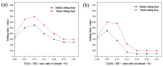 Effect of XA dosage on setting time: (a) XACa (HS); (b) XANa (HS).