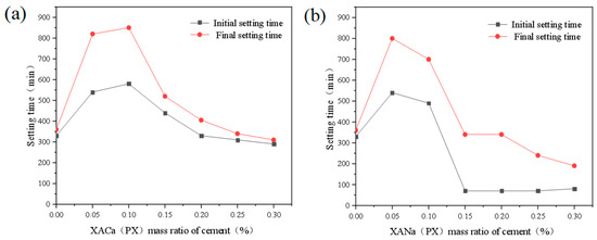 Effect of XA dosage on setting time: (a) XACa (PX); (b) XANa (PX).