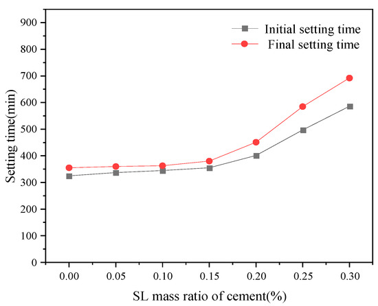 SL has been utilized as a retarding agent for oil well cement for decades. Although the exact mechanism by which lignosulfonate delays silicate formation is not yet clear, it is speculated that this mechanism is a combination of adsorption and nucleation [27]. According to studies, sulfonates and hydroxyl groups can be adsorbed on the CSH gel layer of hydrated cement. This means the sulfonates and hydroxyl groups existing in the lignosulfonate can be mixed into the CSH gel layer, resulting in changes in the morphology of the CSH gel and a more impermeable structure. This will result in a waterproof effect, slowing down further hydration. The more sulfonates and hydroxyl groups it provides, the tardier the hydration proceeds, which led to the proportional linear result in the figure above.