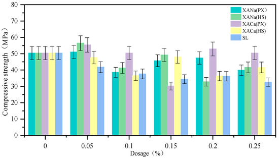 The influence of four xylonic acid water reducers on the compressive strength of test blocks with mortar exhibited varied performance, as depicted in Figure 5. At a low admixture of 0.05%, the compressive strength improved; however, it decreased to some extent as the admixture increased. At the optimal admixture of 0.2%, the hydrolysate group demonstrated superior performance with minimal strength reduction. Notably, XACa (HS) even exhibited a slight increase in compressive strength. This can be attributed to the retardation effect of xylonic acid at low to medium doping levels, which slows down the hydration rate and leads to lower 7-day strength formation. Considering the results of the aforementioned experiments, it is evident that the HS group outperformed the others. Therefore, subsequent experiments in this study employed two hydrolysates as xylonic acid water reducers.