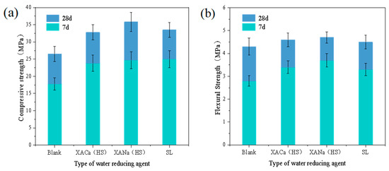 Effect of different reducers on the compressive and flexural strengths: (a) compressive strength; (b) flexural strength.