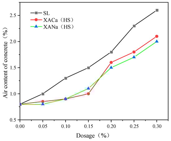 As illustrated in the accompanying Figure 7, the xylonic acid water reducer consistently introduces less air into the concrete compared to the SL group as the admixture level increases. This reduction in air content subsequently leads to a decrease in the resistance to chloride ion penetration during the chloride ion penetration resistance experiments [29,31]. The results are basically consistent with Zhou.