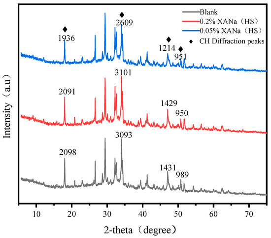 The intensity of the characteristic peak of calcium hydroxide (CH) in the control group demonstrated similar levels to the 0.2% XANa (HS)-doped samples, while it was significantly higher than that observed in the 0.05% XANa (HS) samples, as indicated by the XRD plots (Figure 8).