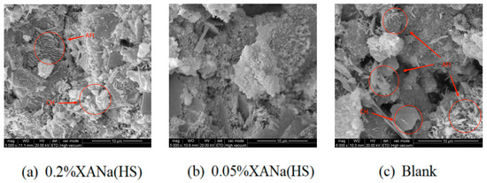 Electron micrographs further confirmed these findings (Figure 9), revealing increased formation of AFt and CH in the 1-d cement paste with 0.2% XANa (HS) compared to the control group. Conversely, the 1-d cement paste with 0.05% XANa (HS) exhibited considerably less AFt, and no CH formation was observed.