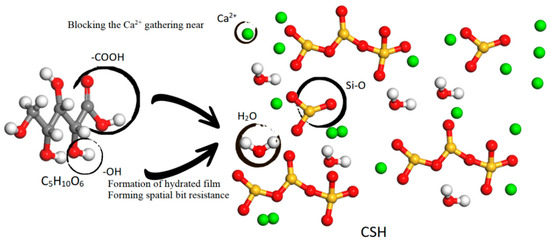 According to Figure 10 (based on the Pellenq model [35]), carboxyl and hydroxyl groups exhibit a propensity to chemically adsorb to the Si-O bonds present on the surface of cement particles [34,36]. Additionally, hydrophilic groups combine with water molecules [33,34,35], resulting in cement particles and water sharing similar groups. This interaction between identical groups provides a lubricating effect among cement particles, while the hydrophilic end of the xylonic acid molecule interacts with water, reducing surface tension [37,38,39]. Consequently, water molecules diffuse and disperse more effectively in the concrete mixture, improving the fluidity of the cement slurry and acting as a water-reducing agent.