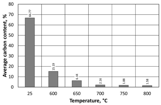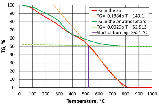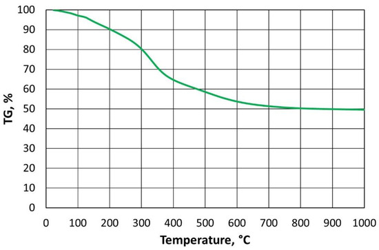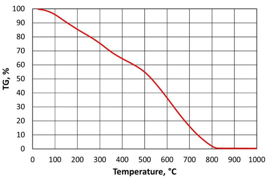 If we compare the data in Figure 3 with the results in Figure 4, it can be concluded that, over a certain temperature range, furan binder breakdown (degradation) occurs regardless of the atmosphere in which the process is carried out. Changes in TG values are not identical but follow a similar pattern. Only above a temperature of 500 °C can the atmosphere in which the test is carried out begin to play an important role. In the presence of atmospheric oxygen, the sample burns (destroys), hence the almost proportional weight loss of the furan binder. In contrast, the second sample, in the absence of oxygen in the analyser’s working space (Figure 4), has not fully decomposed by 1000 °C, leaving approximately 49.54% of the sample mass containing carbonised carbon.
