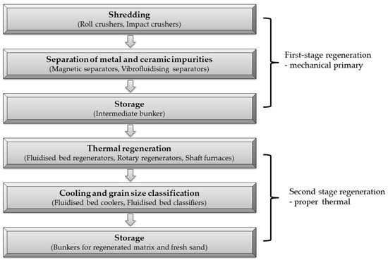 The regeneration of spent moulding or core sand with organic binders can be divided into two stages: stage I preliminary (mechanical) regeneration and stage II proper (thermal) regeneration.