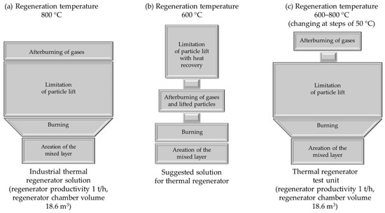 Figure 7b presents a proposal for a different solution to the thermal regenerator based on existing designs and taking into account the phenomena observed during the thermal regeneration process tests carried out. In the suggested solution, the regeneration chamber is split into several modules in which the individual stages of thermal regeneration are separated.
