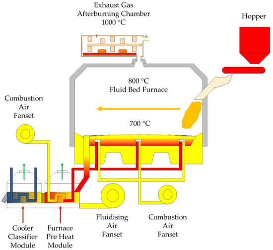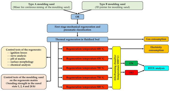 Under industrial conditions, it was not possible to interfere with a commercial organic binder sand regeneration unit. Therefore, in the course of the research, a cursory action was chosen, opting only to add, in addition to the standard thermal regenerator system, a flue gas afterburning chamber of our own design while reducing the temperature during regeneration, which is set at 800 °C in the device studied [1,20,61].