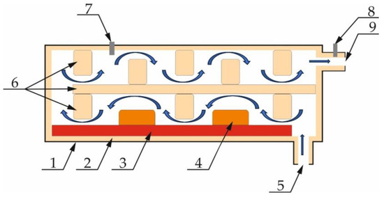 Illustrative diagram of the flue gas afterburning chamber: (1) steel armour; (2) insulation material; (3) heating elements; (4) ceramic mass fittings; (5) flue gas inlet; (6) insulation material fittings; (7) temperature sensor; (8) flue gas intake area; (9) flue gas outlet.