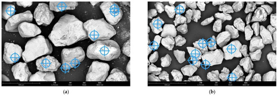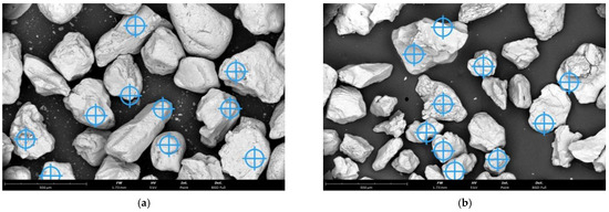 Sieve analysis was performed on an LPzE-2e laboratory shaker from Multiserw-Morek with a set of metal sieves that conform to DIN ISO 3310-1 [58]. The mesh sizes on the sieves were as follows: 1.4; 1.0; 0.71; 0.5; 0.355; 0.25; 0.18; 0.125; 0.09; 0.063 mm. The measurement consisted of placing a 50 g weight on a laboratory shaker and running the vibration for 15 min. After this time, a sample of the sand deposited on each sieve was collected and weighed. The main fraction of sand was determined by the largest amount of sand collected on three adjacent sieves. The results presented in the paper are the average of the two measurements.