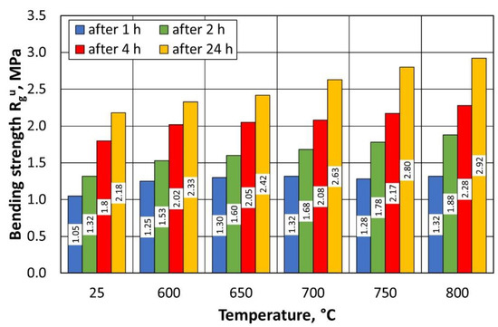 If straight lines are drawn through the rectilinear sections of the curves obtained, their point of intersection can be taken as the minimum temperature required for the thermal regeneration of the binder under test; from this limiting temperature, the residual decomposition products (carbonised carbon) resulting from the degradation of the binder are successively burnt off. From an analysis of Figure 3, it can be seen that the complete combustion process occurred at a temperature of approximately 812 °C; however, it should be assumed (noted) that it is not the temperature, which builds up at a rate of 10 °C/min in the NETZSCH STA 449 F3 Jupiter® thermal analyser (Erich NETZSCH GmbH & Co. Holding KG, Selb, Germany), that plays the main role, but rather the time required for the complete combustion (oxidation) of the sample of the binder under test.