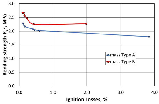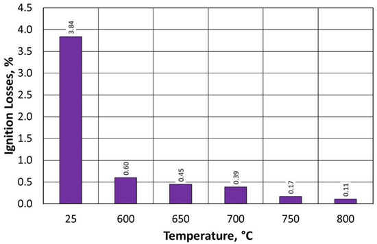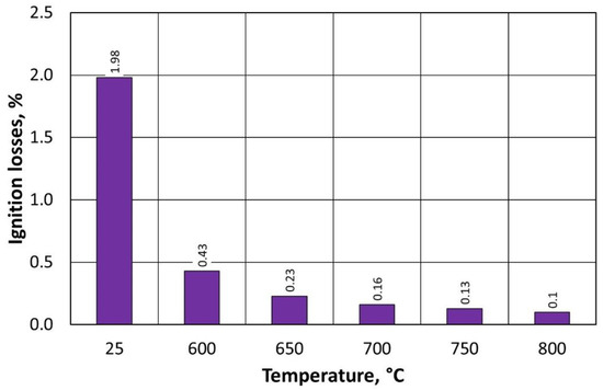 The measurement of the ignition losses was carried out in accordance with BN 83/4021 and was carried out as follows: a 50 g sample weighed on a Radwag MA 110.R balance (RADWAG Wagi Elektroniczne, Radom, Poland) was inserted into a ceramic crucible. Three samples were weighed for each ignition loss analysis. The samples were then placed in a Remix KRE-11/8 roasting furnace (Remix S.A., Świebodzin, Poland), with a roasting temperature of 900 °C and a holding time of 1 h in the furnace. After roasting, the samples were allowed to cool in a desiccator. After reaching room temperature, the samples were again weighed on a Radwag MA 110.R balance with an accuracy of 0.01 g. Based on the difference in the obtained weights of the samples before and after roasting, the average value of the ignition losses was calculated.