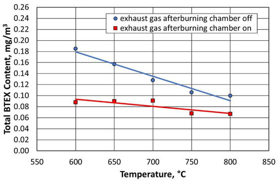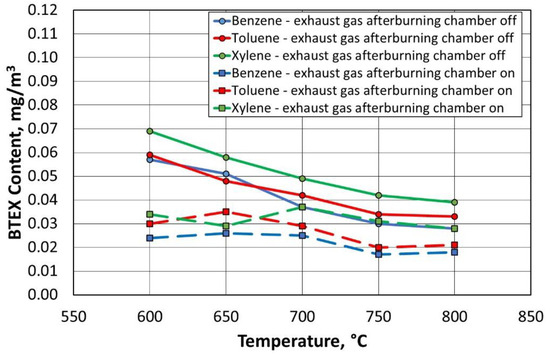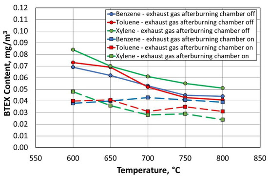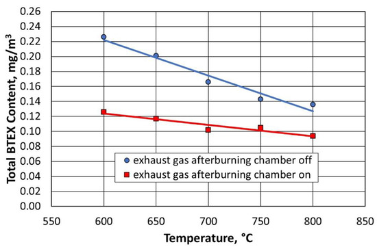 Due to the use of an afterburning chamber, the concentration of BTEX gases was reduced for both the standard thermal regeneration process performed at 800 °C and for the procedure performed at a reduced temperature of 600 °C.