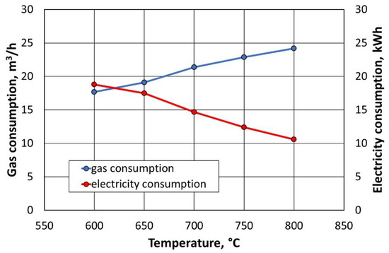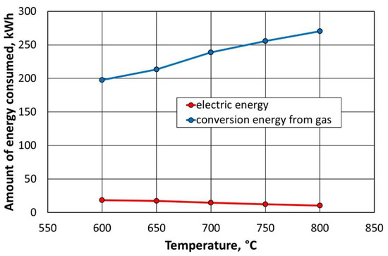 Based on the data presented in Figure 26, it can be concluded that the use of an additional gas combustion chamber generates 10 times less energy consumption, with respect to how much is consumed by the thermal regenerator chamber alone. At the same time, lowering the temperature in the regenerator slightly increases the afterburning chamber of the energy consumption of the flue gas. On the contrary, the energy consumption of natural gas decreases significantly when the regeneration temperature is reduced by 200 °C.