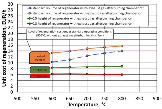 In the search for a reduction in the cost of thermal regeneration, and while maintaining a comparable environmental impact, the issue of the size of the regenerator chamber is also important. A standard unit has a large volume. Under the assumption that a larger space to be heated requires the provision of more energy, in a situation of height reduction, we reduce the space that absorbs a certain amount of energy. The function of the previous high chamber is taken over by an additional afterburning chamber. From the point of view of device performance, the width and length of the thermal regenerator remain unchanged. Table 9 shows a simulation of the costs associated with reducing the height of the thermal regenerator chamber by 50% and 70%. The presented analysis applies to the situation of the solution of the regenerator design shown in Figure 7b (suggested solution). Figure 29 shows a graphical illustration of the estimated unit costs of the thermal regenerator operation performed.