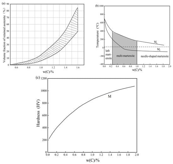 Relationship between carbon and some microstructures. (a) Effect of carbon mass fraction on retained austenite; (b) effect of carbon mass fraction on martensite morphology; (c) effect of carbon mass fraction on martensite hardness.