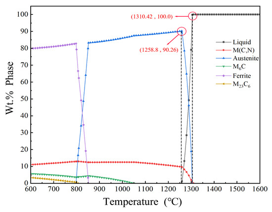In Figure 2, high-molybdenum–vanadium high-speed steel is 100% in the liquid phase at >1310.42 °C; therefore, 1310.42 °C is the material’s melting point. M(C,N) carbides will slowly precipitate when the temperature drops below the melting point. When the temperature drops to 1305.04 °C, austenite will begin to precipitate as a result of the reaction between M(C,N) carbides and the liquid metal. As shown in Figure 2, when the austenite content reaches its maximum value at 1258.8 °C, the liquid phase completely disappears and the material austenitizes, creating the austenite solid-phase line.