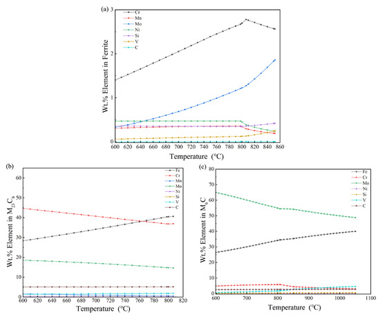 Ferrite is a phase region that alloy steel must pass through during the heating process. Figure 3c shows the change in content for each ferrite element according to JMatPro. When the temperature is between 600 and 810 °C, chromium content maintains its rising trend. When the chromium content reaches its peak at 806.55 °C, molybdenum content in the interval shows a straight line of upward growth. Manganese, silicon, and nickel levels in the ferrite phase are relatively stable and are conducive to the ferrite’s stabilization of these elements. Vanadium and carbon are very low trace elements in ferrite. Vanadium and carbon are also trace elements in ferrite with very low content and little change. Due to ferrite’s low concentration of dissolved carbon, carbon is mainly combined with other strong carbon compounds to produce M(C,N), M6C, and M23C6 carbides in this phase.