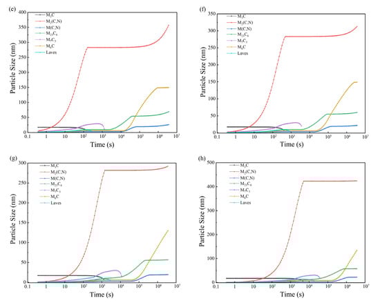 Carbide dimensions of Fe—3.0, Cr—0.3, Mn—7.0, Mo—0.4, Ni—0.3, Si—7.0, and V—2.0 high-speed steel at different tempering temperatures: (a) 770 °C; (b) 740 °C; (c) 710 °C; (d) 680 °C; (e) 650 °C; (f) 620 °C; (g) 590 °C; (h) 560 °C.