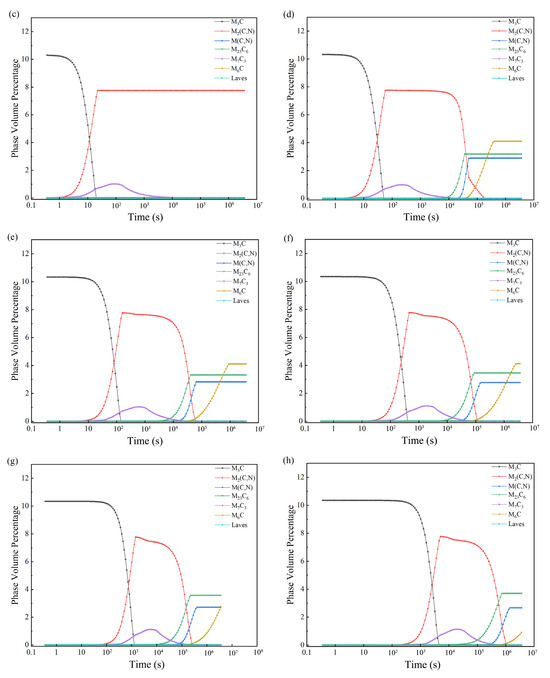Carbide compositions of Fe—3.0, Cr—0.3, Mn—7.0, Mo—0.4, Ni—0.3, Si—7.0, and V—2.0 for high-speed steel at different tempering temperatures: (a) 770 °C; (b) 740 °C; (c) 710 °C; (d) 680 °C; (e) 650 °C; (f) 620 °C; (g) 590 °C; (h) 560 °C.