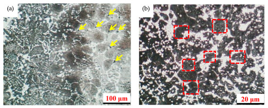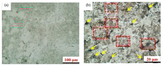 SEM photo of quenching process at 1170 °C: (a) ×100, (b) ×500 (the red rectangles indicate M6C compounds and the yellow arrows indicate VC grains).