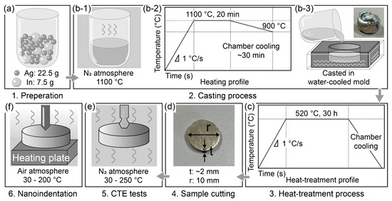 Schematics of experimental procedures. (a) Raw material preparation. Casting process, with (b-1) depicting melting conditions, (b-2) showing temperature profiles during melting, and (b-3) illustrating the casting process in the water-cooled mold. (c) Temperature profile during the heat treatment process. (d) Dimensions of samples for measurements. (e) CTE tests. (f) Nanoindentation tests.
