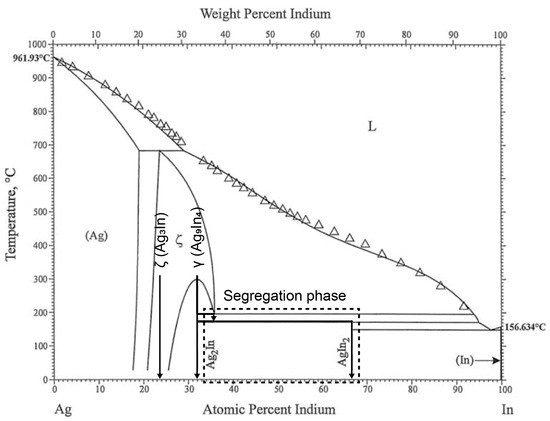 where a and b are constants with regressed values of 1.84 and 0.00216, respectively. A lower b values signifies a slower decline in hardness with increasing temperature, indicating better thermostability. This linear decline differs from the behavior observed in our previous study on Ag9In4, where the hardness remained nearly constant from 30 °C to 125 °C before exhibiting an exponential decrease up to 250 °C [26]. The hardness obtained from the nanoindentation tests is primarily associated with dislocation movement [30], which is influenced by thermally activated vacancies [29]. Based on the phase diagram shown in Figure 3, the melting point of the ζ (Ag3In) phase is approximately 660 °C, whereas gamma-Ag9In4 undergoes a solid-state reaction to the ζ (Ag3In) phase at around 300 °C. Consequently, this suggests that a temperature of 200 °C may not have been sufficient to activate thermal vacancies, thereby causing a noticeable softening effect in the ζ (Ag3In) phase. This phenomenon is consistent with the maintenance of hardness behavior observed in Ag9In4 within the lower temperature range of 30–125 °C.