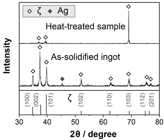 - Pure and densified ζ (Ag3In) bulk samples were fabricated by being cast in a water-cooled steel mold, followed by undergoing heat treatment at 520 °C for 30 h. Both the as-cast and heat-treated samples comprised the ζ (Ag3In) phase, and no phase transition was found. The heat treatment process was used for homogenization.