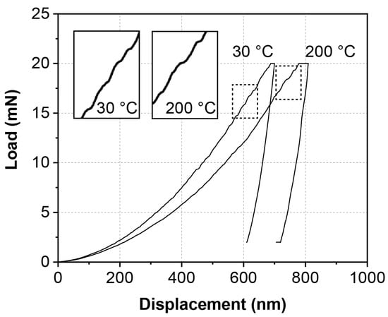 Firstly, the displacement–load curves of the ζ (Ag3In) phase taken from nanoindentation tests at 30 °C and 200 °C are shown in Figure 5. “Pop in” phenomena are observed from both curves during loading, as shown from the magnified illustrations in Figure 5. This indicates that dislocations were activated under both temperatures [29]. Meanwhile, the “Pop in” phenomenon does not seem to increase at 200 °C, which, to some extent, suggests the good thermal stability of the ζ (Ag3In) phase. In addition, two characteristics of the ζ (Ag3In) phase can be deduced from the 200 °C curves. Firstly, no significant creep behavior is observed in the ζ (Ag3In) phase at 200 °C. Secondly, the ζ (Ag3In) phase does not shown significant softening at 200 °C.