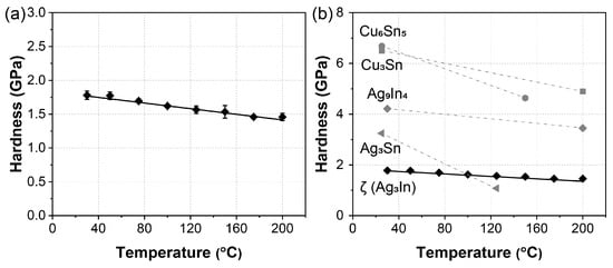 - As the temperature increased from 30 °C to 200 °C, the hardness of the ζ (Ag3In) phase decreased linearly from 1.78 GPa to 1.46 GPa. Correspondingly, the Young’s modulus decreased linearly from 82.3 GPa to 66.5 GPa. Both values are lower than those of the other commonly used IMCs. Furthermore, the ζ (Ag3In) phase exhibited relatively good thermostability in terms of these properties.