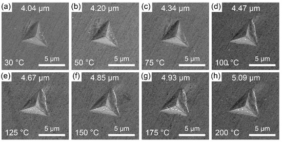 The slight and linear decrease in the hardness of the ζ (Ag3In) phase was further confirmed through an analysis of the indent sizes, as shown in Figure 7. With increasing temperature, the size of the indenter slightly increases from approximately 4.04 μm at 30 °C to 5.09 μm at 200 °C. Notably, no cracks were observed at the tip or slip bands around the edge for any of the indents.