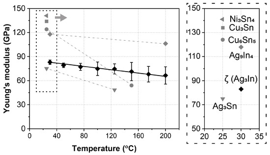 Compared to other IMCs, as shown in Figure 8, several characteristics of the ζ (Ag3In) phase are revealed. First, at room temperature, the ζ (Ag3In) phase possesses a significantly lower Young’s modulus than Ni3Sn4, Cu3Sn, Cu6Sn5, and Cu3Sn but only slightly higher than that of Ag3Sn. Second, at elevated temperatures, the rate of decrease (as reflected by the d value) for the ζ (Ag3In) phase is slower than that of Cu6Sn5 and Ag3Sn but similar to that of Ag9In4. In summary, the ζ (Ag3In) phase has a low Young’s modulus with excellent thermostability compared to other IMCs in the temperature range of 30–200 °C.