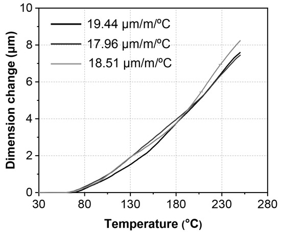 Figure 9 shows the dimensional changes in the ζ (Ag3In) phase caused by thermal expansion during the heating. The dimensional changes of the ζ (Ag3In) phase during a temperature change from 30 °C to 70 °C cannot be recorded due to the cancellation effect resulting from the expansion of the glass bar used for detection and the tested specimen. Therefore, the total dimensional change is considered when heating the specimen from 70 °C to 250 °C, and this value is approximately 7.76 ± 0.35 μm, averaged by the three measurements, as illustrated in Figure 9. Consequently, the averaged CTE value is 18.63 ± 0.61 μm/m/°C. In comparison, the obtained CTE value of Ag9In4, as investigated in our previous study, was 20.6 μm/m/°C [26].