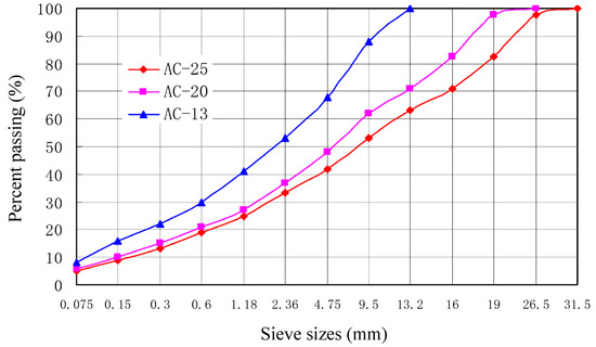 Vehicles of the Hanchang expressway are mainly coal transport vehicles, and its cumulative equivalent axles of design in the direction of heavy and light vehicles are 117.75 million times and 36.86 million times, respectively. The asphalt of the upper course and middle course was Shell SBS-70-modified asphalt, and the lower course used Zhonghai AH-70 asphalt. The dense-gradation asphalt mixtures of AC-13, AC-20, and AC-25 were used in the upper course, middle course, and lower course, respectively, and their aggregate gradations are shown in Figure 3. Considering the rutting performance and fatigue, the optimal oil–stone ratio of asphalt mixtures was determined comprehensively by comparing Spin Gravity Compaction and Gyratory Testing machine rotary compaction. The optimal oil–stone ratio of AC-13, AC-20, and AC-25 is 3.84%, 3.73%, and 3.41%, respectively.