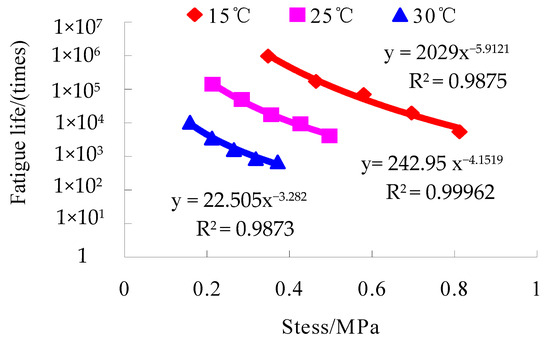 Based on the reference temperature T0 = 25 °C, the of different temperatures can be obtained using the horizontal shift function in Origin 9.0 software. According to Equation (4), and were obtained using the linear fitting function in 1stopt 15.0 software. Then, at a different temperature was calculated using Equation (7). According to Equation (8) and Table 14, the dissipation compliance of structures A, B, and C were obtained, and their results were 2.55 × 10−5, 2.51 × 10−5, and 2.6 × 10−5, respectively. Based on Equation (15) and Figure 6, the result of was obtained using the linear fitting function in 1stopt software. For equivalent fatigue temperature, the asphalt bottom stress of structures A, B, and C were calculated using Shell design software BISAR3.0, and the results are 0.654 × 10−5 MPa, 0.591 × 10−5 MPa, and 0.611 × 10−5 MPa, respectively. At last, according to Equation (9), the fatigue lives of structures A, B, and C were obtained, and their results are 1.68 × 1011 times, 2.1 × 1011 times, and 1.89 × 1011 times, respectively. Their fatigue lives are all far bigger than the design load, and structure B has the best anti-fatigue performance.