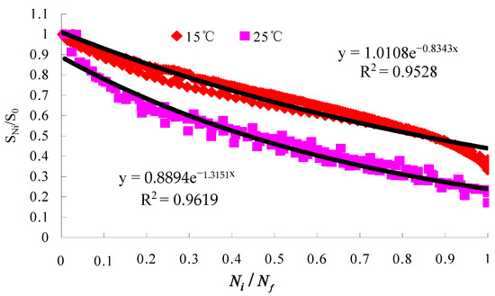where and are constants; and are the test temperature and the reference temperature, respectively, in °C; and and are the viscoelastic parameters of Burgers’ model. Considering the difference between the indoor fatigue test and field conditions, the fatigue life of pavement can be predicted using Equation (9) [1,26].