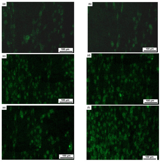 To assess cell proliferation, a 2 mL volume of complete growth medium was employed, maintaining the samples at 37 °C within an environment containing 5% carbon dioxide. The medium was refreshed every 2 days to ensure optimal conditions for cell growth. The metrics for cell adhesion and colonization were quantified as a percentage of LDH activity in cells coincubated with the alloys in comparison to LDH activity in the control group (% of the control). This assessment was performed using the LDH Cytotoxicity Assay Kit from Thermo Fisher Scientific (Waltham, MA, USA), following the manufacturer’s provided instructions. For visualization, the cells were stained with Calcein AM (Sigma-Aldrich, St. Louis, MO, USA) and observed via fluorescent microscopy using the LionHeart digital microscope (Perkin Elmer, Shelton, CT, USA).