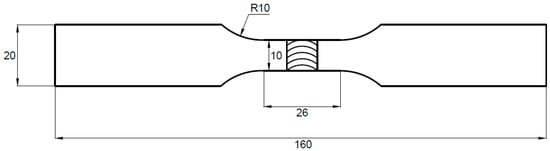The lower nozzle (de Laval nozzle) was supplied with compressed air at a pressure of 0.6 MPa. The airflow stream exiting from the lower nozzle entrained steel balls from the bottom of the working chamber and then directed them through the upper nozzle onto the processed sample, attached to the inner side of the cover. The distance between the processed surface and the upper nozzle was 100 mm. The intensity of peening was determined based on the deflection arrow of control plates and is expressed in Almen units (corresponding to the deflection arrow value of the control plate expressed in hundredths of an inch or mm). After the peening of welded joints, the deflection arrow of type A control plates was 0.15 mm. The samples in the as-welded state and after shot peening were investigated in terms of macrostructure, and low-cycle fatigue properties supported by fractography analysis. The macrostructure of the metallographic specimen was revealed using Keller reagent (20 mL H2O + 5 mL HNO3 + 1 mL HCl + one drop of HF) with an etching time of 10 s. The macro- and microstructure observations were conducted on an Olympus LEXT OLS 4100 digital light microscope. The LCF tests were carried out on specimens with a gauge width of 10 mm and length of 25 mm according to ISO standard 12106:2017 in a total strain-controlled condition with asymmetry coefficient R = 0.1 []. The applied total strain amplitudes were: 0.35%, 0.4%, 0.5%. The scheme of the fatigue sample is presented in Figure 3.