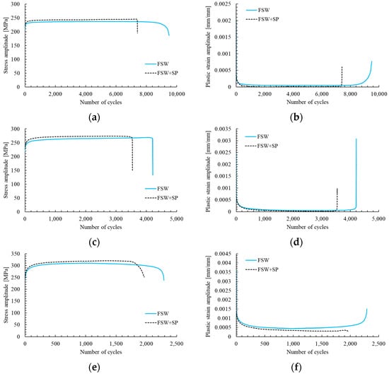 Stress (a,c,d) and plastic strain amplitudes (b,d,f) vs. the number of cycles for the as-welded samples (FSW) and shot-peened joints (FSW + SP) at total strain amplitude of εac =0.35% (a,b), εac =0.4% (c,d) and εac = 0.5% (e,f).