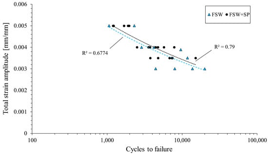 The obtained curves allow us to draw the conclusion that the both as-welded and shot-peened samples have three stages of fatigue life: a short, initial period of cyclic hardening, then a long period of stable cyclic properties, and finally, cyclic softening until failure. In the performed investigation, the welded joints subjected to the shot peening are characterized by a higher value of stress amplitude and a lower value of plastic strain amplitude. These results overlap with other studies on the low-cycle fatigue of shot-peened samples [,]. The cycle fatigue curves are presented in Figure 6. Generally, the obtained data suggest that the shot peening process slightly increased the fatigue life of the FSW joints in the investigated range of total strain amplitudes. Additionally, the peened samples are characterized by a higher repeatability, which is reflected in the values of the R2 coefficients.