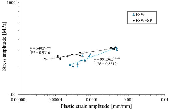 The stabilized cyclic parameters were used to establish a relationship between stress and plastic strain amplitude for the two investigated conditions of the welded joint (Figure 7).